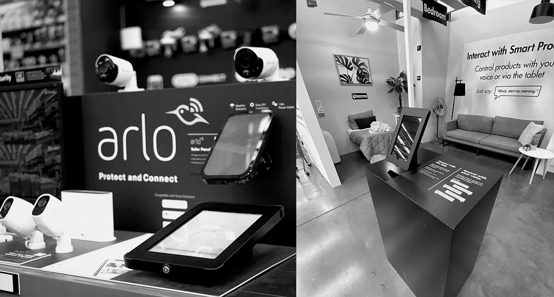 Customers are invited to interact with Smart-Home equipment at Bunnings Warehouse locations throughout Australia and New Zealand. X Pod is a low, fixed-angle solution, allowing clear sightlines to signage, while X Desk allows the screen angle to be adjusted for comfortable usage. For privacy, Bunnings preferred to conceal the front-facing camera of the enclosed Samsung tablets while widening the aperture to allow swipe from off-screen tablet features to better control the smart-home devices. Sprocket designed a custom faceplate to facilitate these requirements. Over an initial period of 4 months, 690 X Pods and 300 X Desks were deployed to all Bunnings Warehouse Store locations throughout Australian and NZ, with additional stores subsequently added as they came online. Sprocket continues to support the fleet to this day.