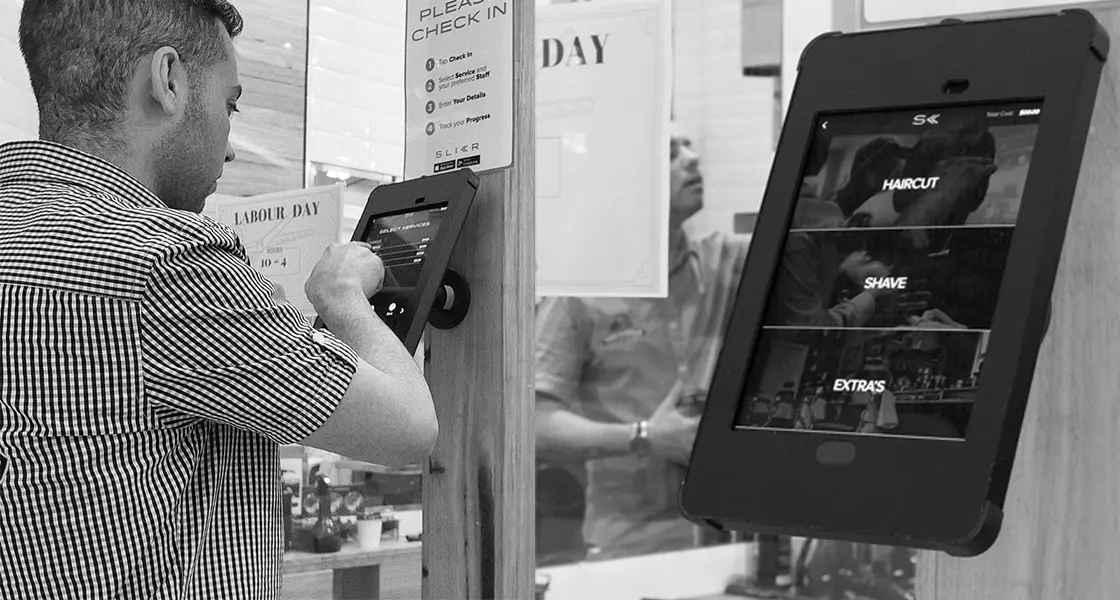Barbershop located in a busy shopping precinct allows customers to book in via a wall mounted Samsung tablet, streamlining customer flows and letting staff get on with the job at hand.