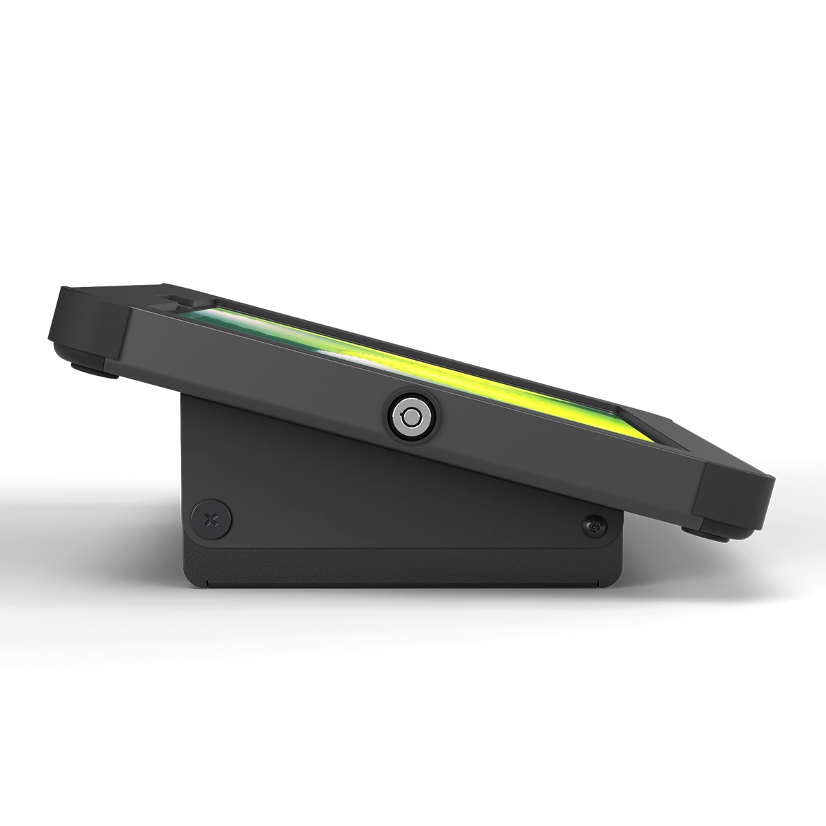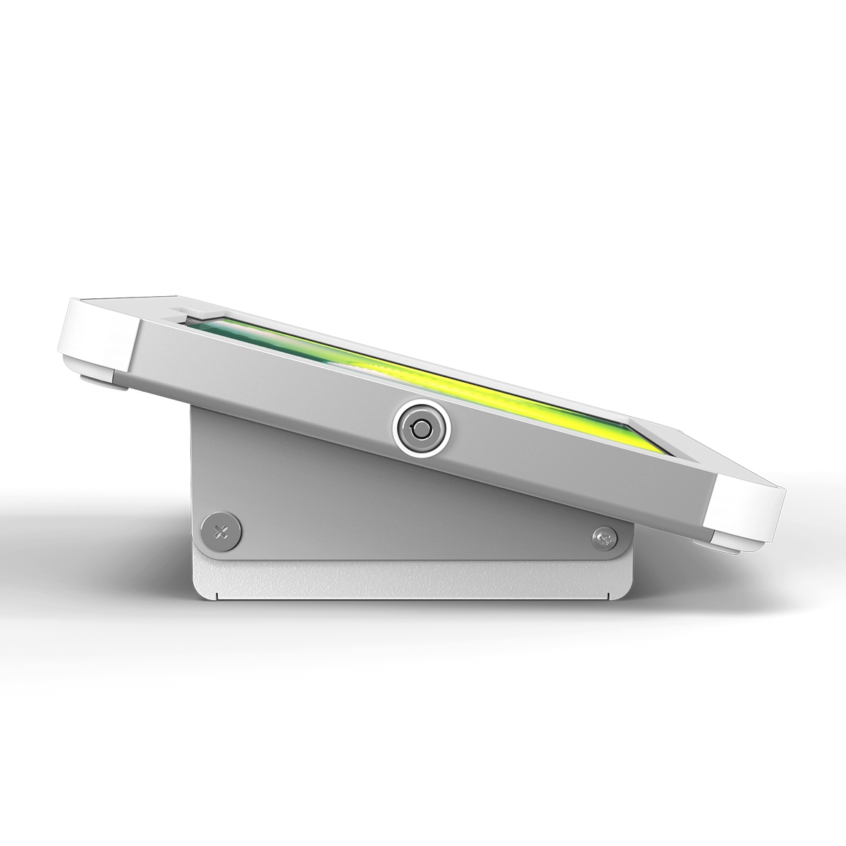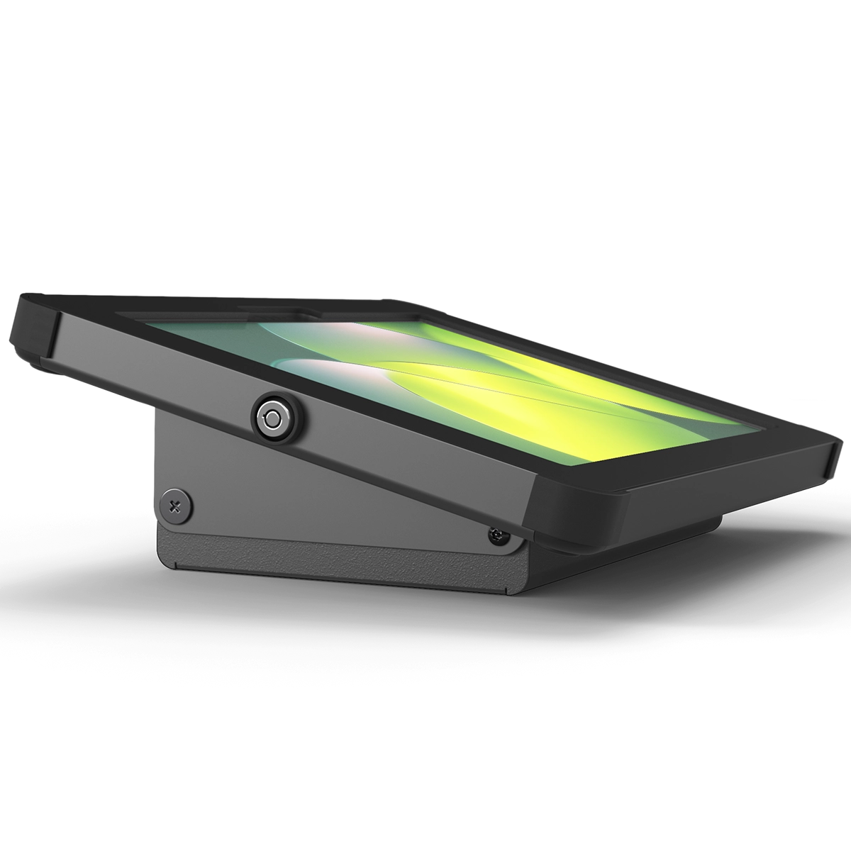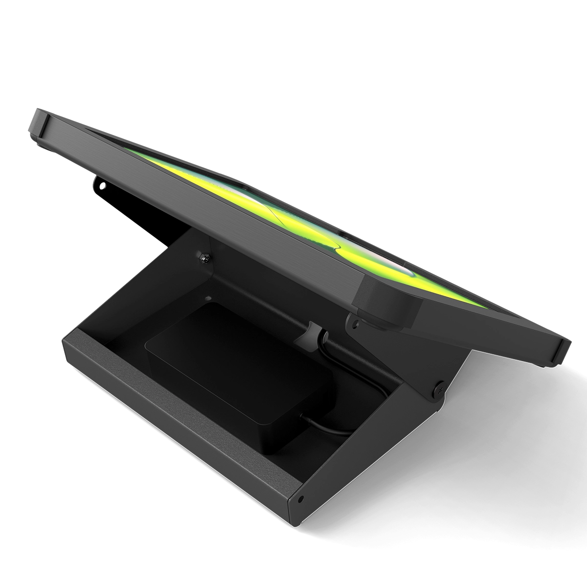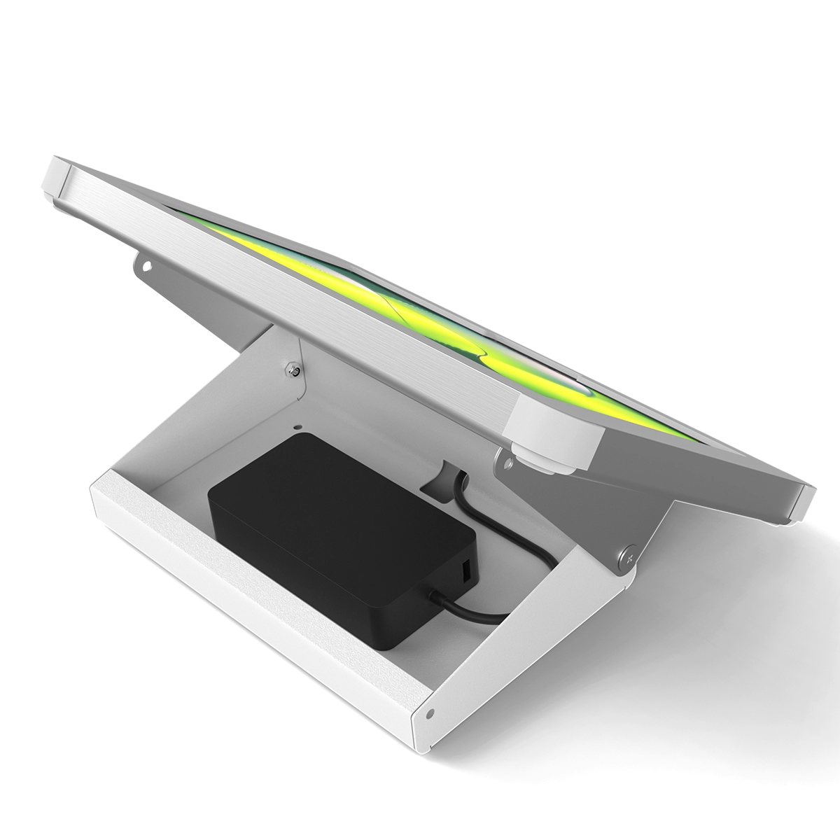Our fixed angle tablet pod is designed to enhance your workspace by providing a dedicated storage area for essential peripheral devices, including PoE and Ethernet adapters or USB hubs. The smart hinge mechanism ensures quick and easy access to your additional devices without disrupting the neatly routed hidden cables.
