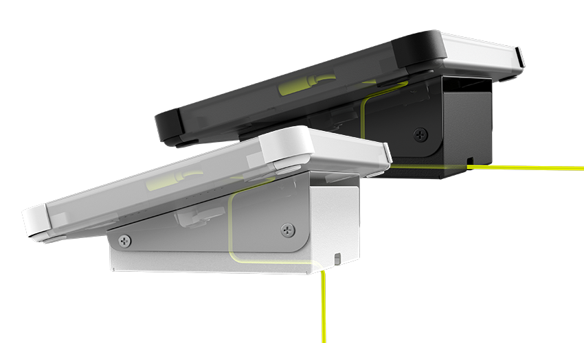 Our fixed angle tablet pod is designed to enhance your workspace by providing a dedicated storage area for essential peripheral devices, including PoE and Ethernet adapters or USB hubs. The smart hinge mechanism ensures quick and easy access to your additional devices without disrupting the neatly routed hidden cables.